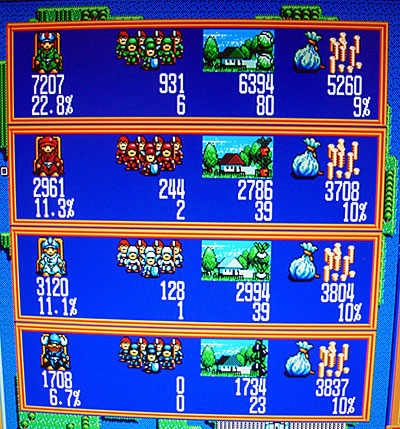 税率設定があり、税率を上げると資金が集まるが兵が増えづらくなり、税率を下げるとその反対になる。また、どの国にも属さない中立のモンスターみたいなのが洞窟から生まれ、家や兵士を無差別に破壊する。